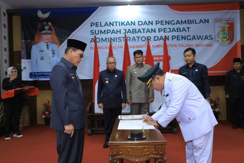 Tulang Bawang Lampung, Harian Sultan.com – Pj Bupati Tulang Bawang Drs.Qudrotul Ikhwan.,MM melantik sebanyak 53 Pejabat Pemimpin Tinggi Pratama di Lingkup Pemkab Tulang Bawang. Kegiatan tersebut di gelar di Ruang Rapat Utama Lantai II Kantor Bupati .