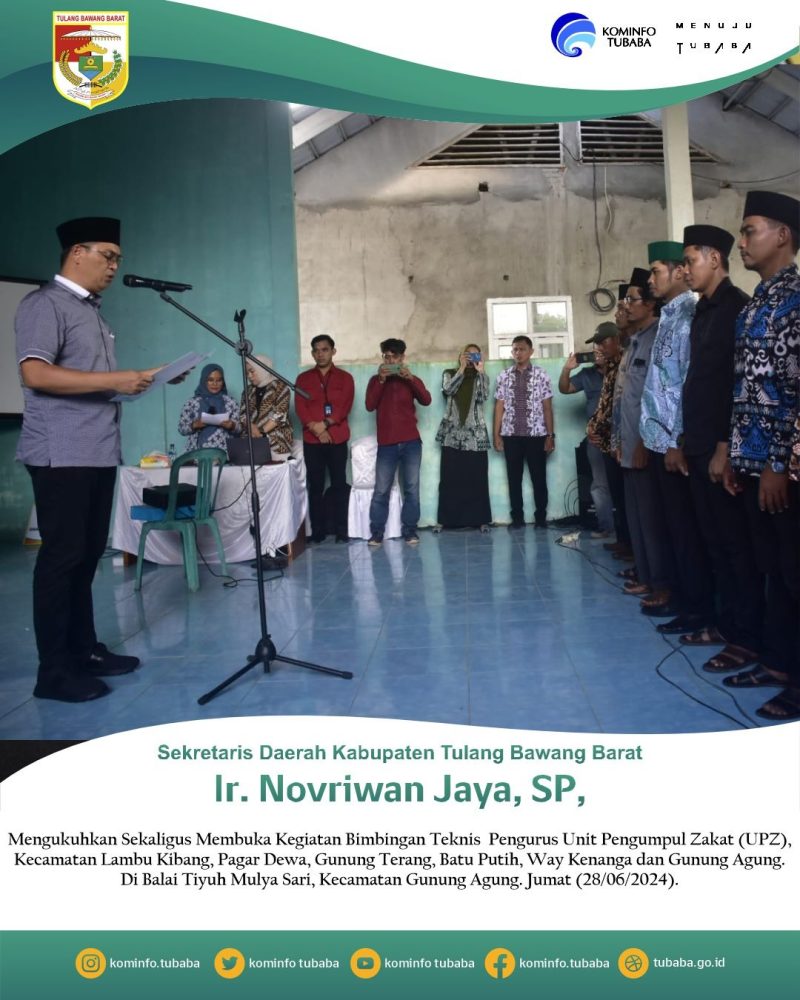 Tubaba, Harian Sultan.com – Sekretaris Daerah (Sekda) Kabupaten Tulangbawang Barat (Tubaba) Ir. Novriwan Jaya, SP., mengukuhkan sekaligus membuka Kegiatan Bimbingan Teknis (Bimtek) Pengurus Unit Pengumpul Zakat (UPZ) Tiyuh, Kecamatan Lambu Kibang, Pagar Dewa, Gunung Terang, Batu Putih, Way Kenanga dan Gunung Agung. Di Balai Tiyuh Mulya Sari, Kecamatan Gunung Agung. Jumat (28/06/2024).