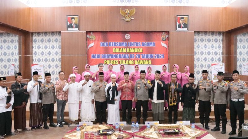 Tulang Bawang Lampung, Harian Sultan.com – Menyambut Hari Bhayangkara ke-78 tahun 2024, Polres Tulang Bawang, Polda Lampung, menggelar kegiatan doa bersama lintas agama yang berlangsung secara daring pada Jum’at (28/06/2024), pukul 19.00 WIB s/d pukul 21.00 WIB, di Aula Wira Satya Mapolres setempat.