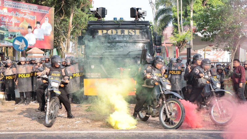 Kegiatan simulasi pengamanan ini dipimpin langsung oleh Kapolres Tulang Bawang, AKBP James H Hutajulu, SIK, SH, MH, MIK, yang dihadiri oleh Ketua DPRD Tulang Bawang, Sopi’i, SH, MH, Forkopimda, PJU Polres, dan 300 personel Polres Tulang Bawang.