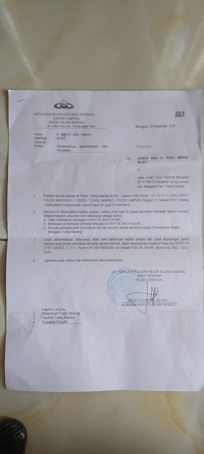RF dilaporkan ke Mapolres Tulang Bawang karena diduga melakukan penganiayaan terhadap Juwita warga Kelurahan Ujung Gunung, Kecamatan Menggala, Kabupaten Tulang Bawang.