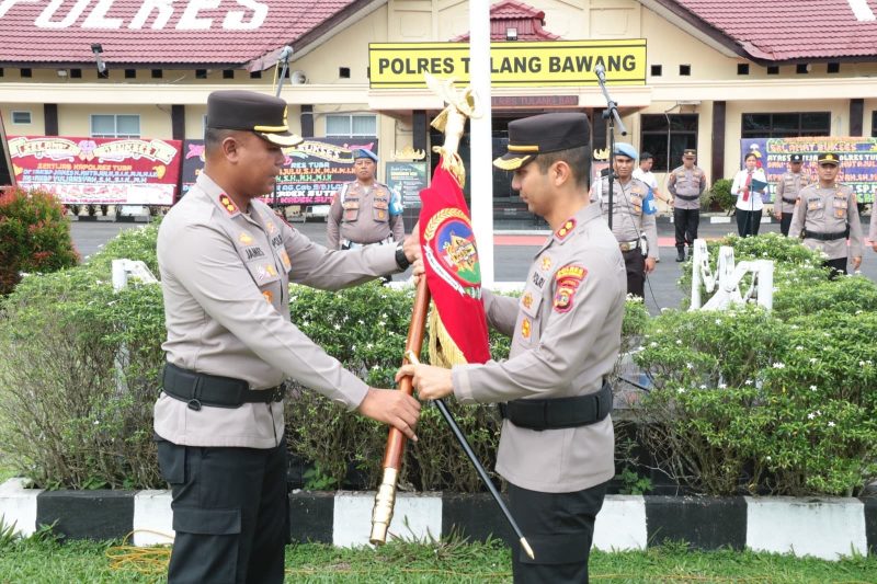Prosesi penyerahan tongkat komando Polres Tulang Bawang dari AKBP James H Hutajulu, SIK, SH, MH, MIK, kepada AKBP Yuliansyah, SH, SIK, MH, sebelumnya telah dilaksanakan di GSG Presisi Polda Lampung yang dipimpin langsung Kapolda Lampung, Irjen Pol Helmy Santika, SH, SIK, M.Si, Jum’at (17/01/2025).