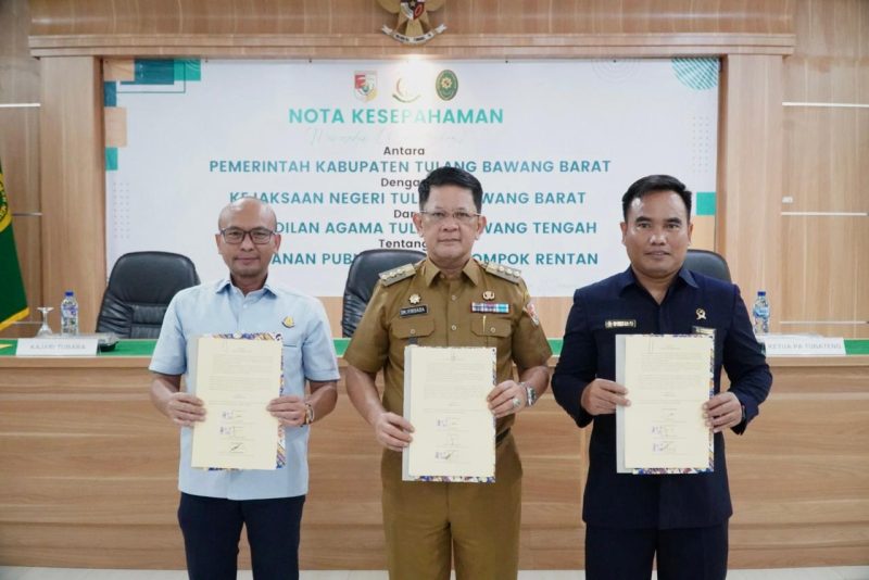 Tubaba, Hariansultan.com – Pemerintah Kabupaten Tulangbawang Barat (Tubaba), Kejaksaan Negeri Tubaba serta Pengadilan Agama Tulangbawang tengah lakukan Penandatangan Kesepakatan Kerjasama Tentang Pelayanan Publik Ramah Kelompok Rentan.