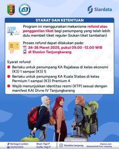 Pelaksanaan Mudik Gratis Menggunakan Kereta Api dijadwalkan pada tanggal 27 – 28 Maret 2025 dan kuota yang tersedia adalah 1700 penumpang.