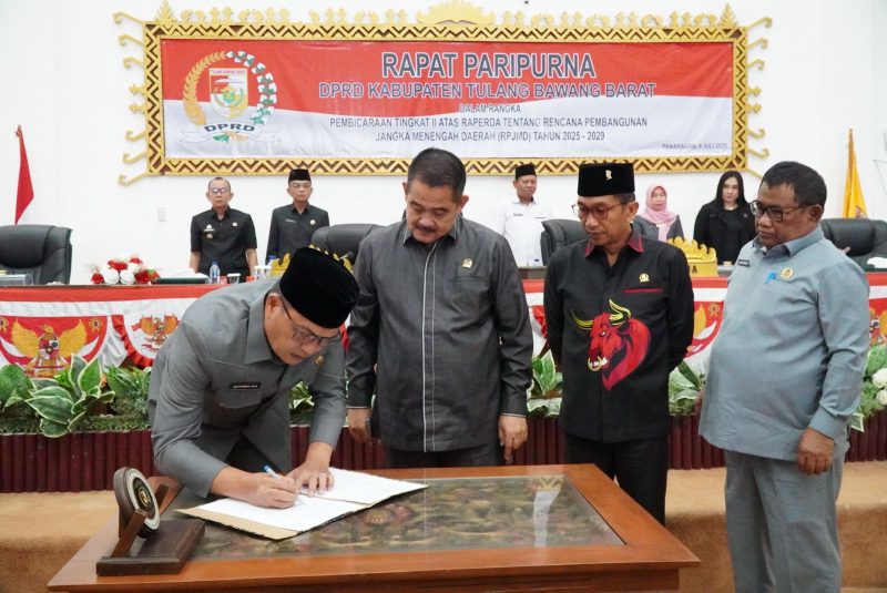 Tubaba, Hariansultan.com – Rapat Paripurna Dewan Perwakilan Rakyat Daerah (DPRD) Kabupaten Tulang Bawang Barat dalam agenda Pembicaraan Tingkat II (dua)Persetujuan Bersama atas Rancangan Peraturan Daerah (Ranperda) RPJMD Kabupaten Tulang Bawang Barat Tahun 2025-2029. Yang berlangsung di Ruang Rapat Sidang Kantor DPRD setempat, pada Rabu (09/07/2025).